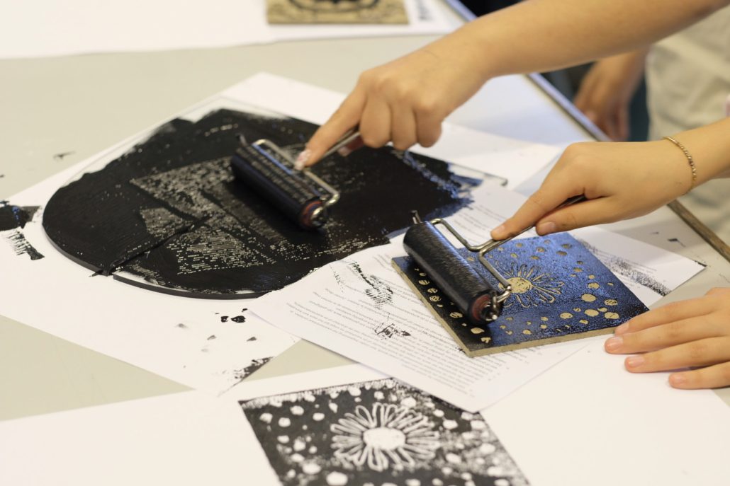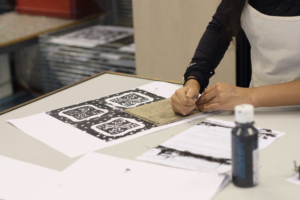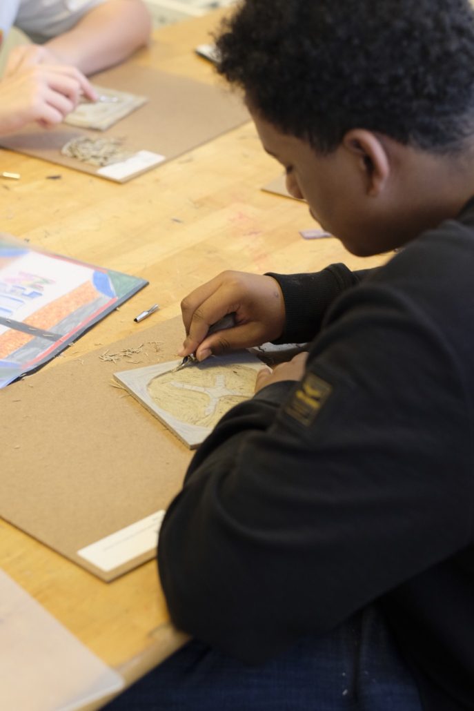 Alle tweede klassers zijn deze periode bij kunst bezig met het maken van linosnedes.