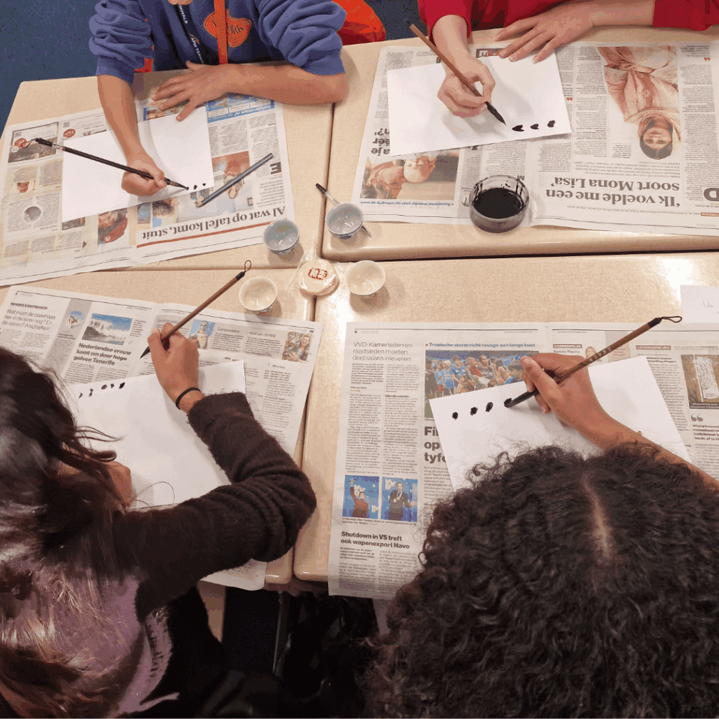 Maandag was de tweede versie van de ‘Masterclass’ met 28 leerlingen uit groep 8 van verschillende basisscholen. Zij deden mee met een les Chinees en leerden over de verschillende karakters en hoe deze over tijd zijn veranderd. Daarna zijn de leerlingen ook zelf met kalligrafie aan de slag gegaan. Het was een volle en gezellige les.